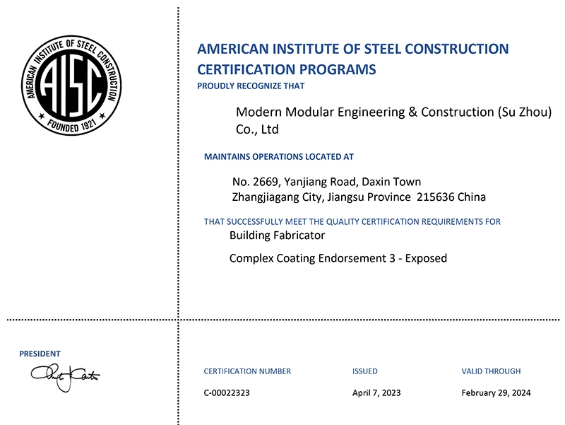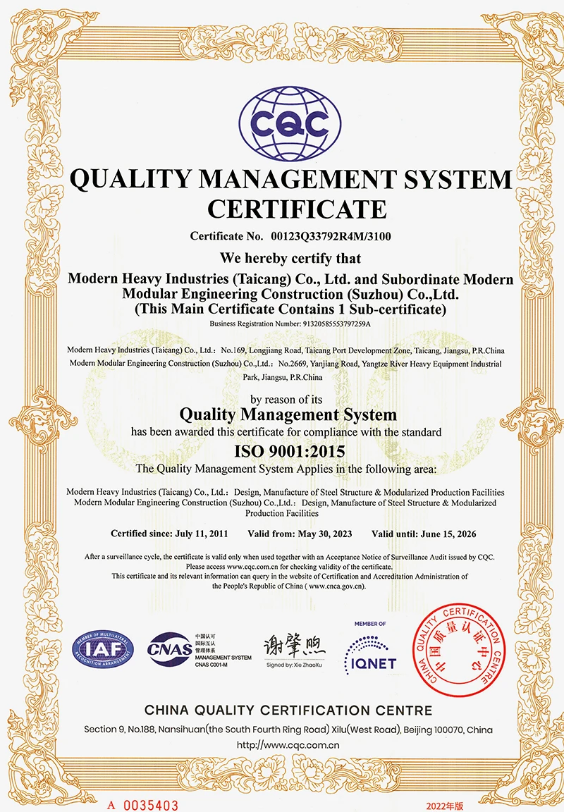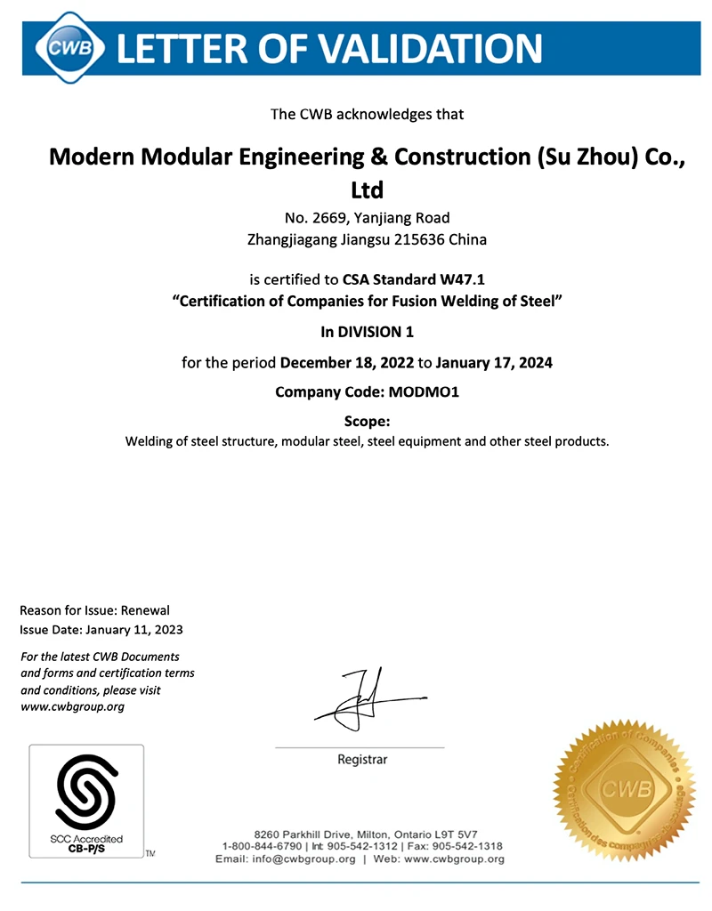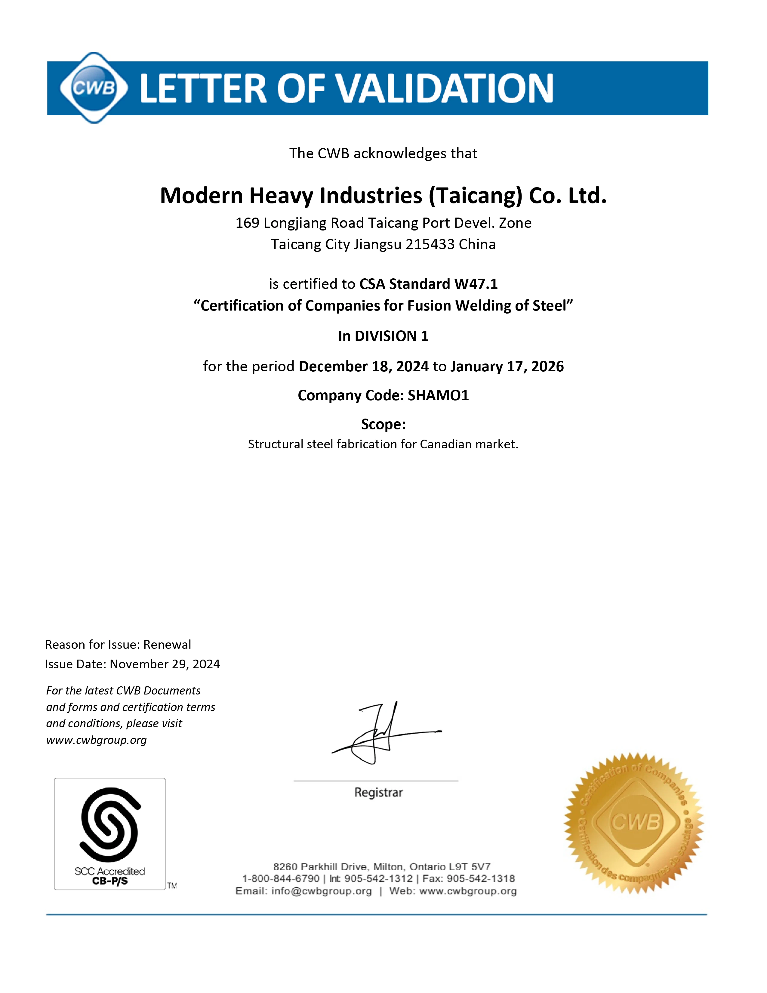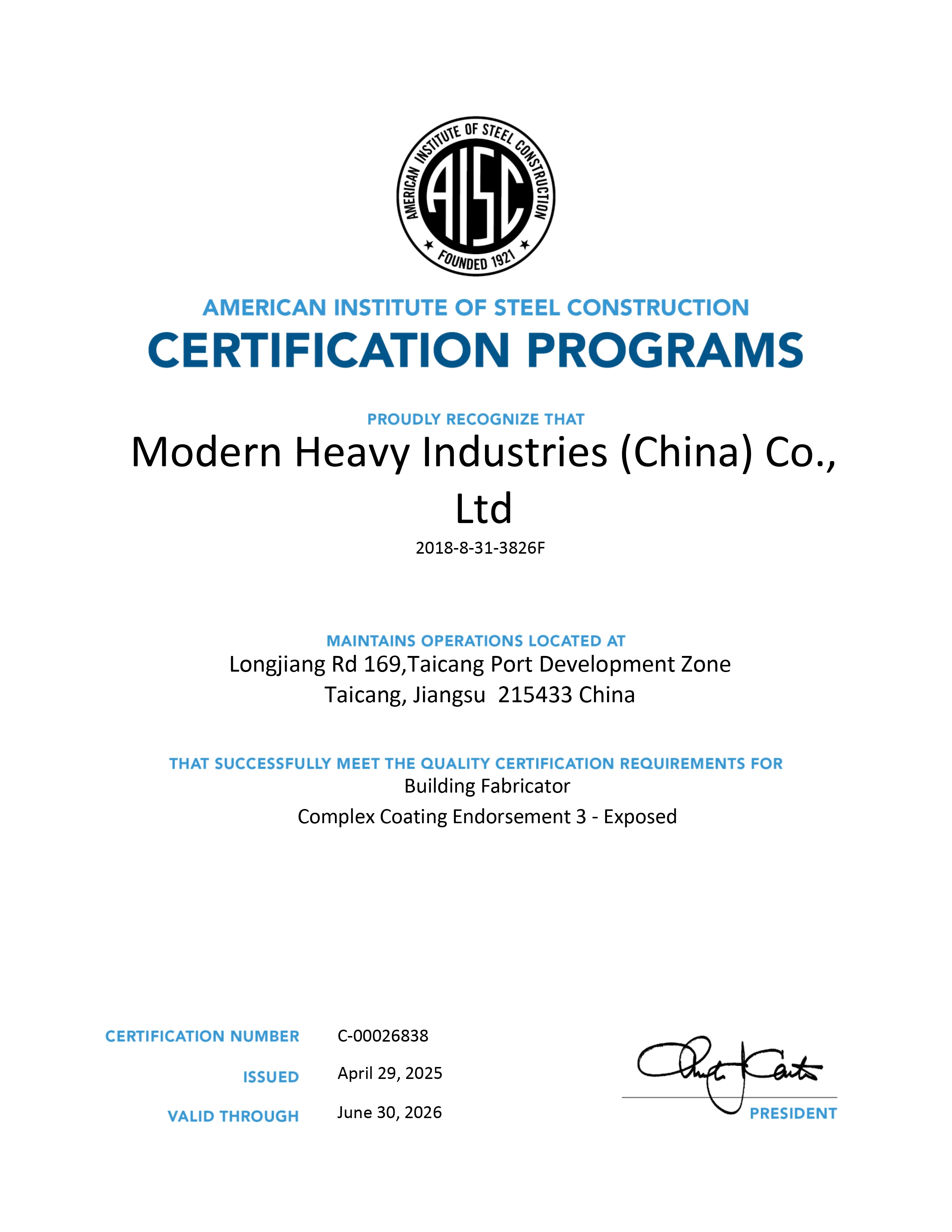 Modern Group workshops maintain a range of certifications to demonstrate compliance with international quality standards for the structural steel industry. Our workforce must be competent and possess the knowledge, skill, organization, experience, procedures, equipment, and dedication to quality to perform fabrication, erection, and modular construction per company certifications.